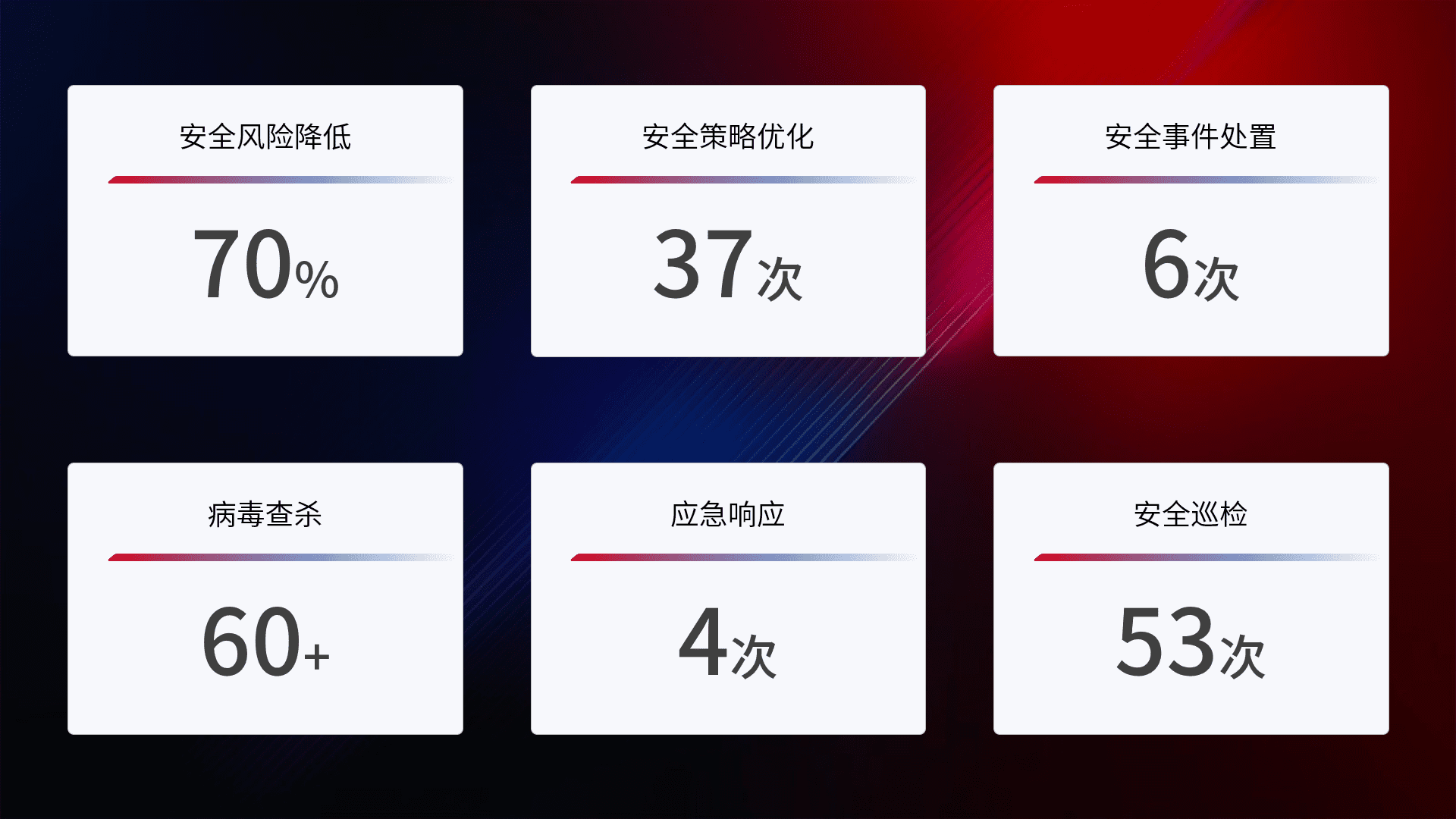 提供全面的安全事件报告体系,,包括处置报告、、、、周报、、、季度和年度总结,,,,结合持续监控,,帮助客户深入了解网络安全状况。。。
